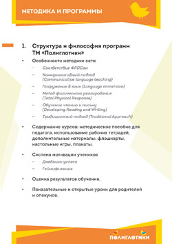 The programmes developed by the methodologists of our network have an obvious advantage over other programmes: they keep up with the times, meet the global standards of preschool and school education, the requirements of the Russian State Educational Standard, and experts say that they even go beyond these standards.